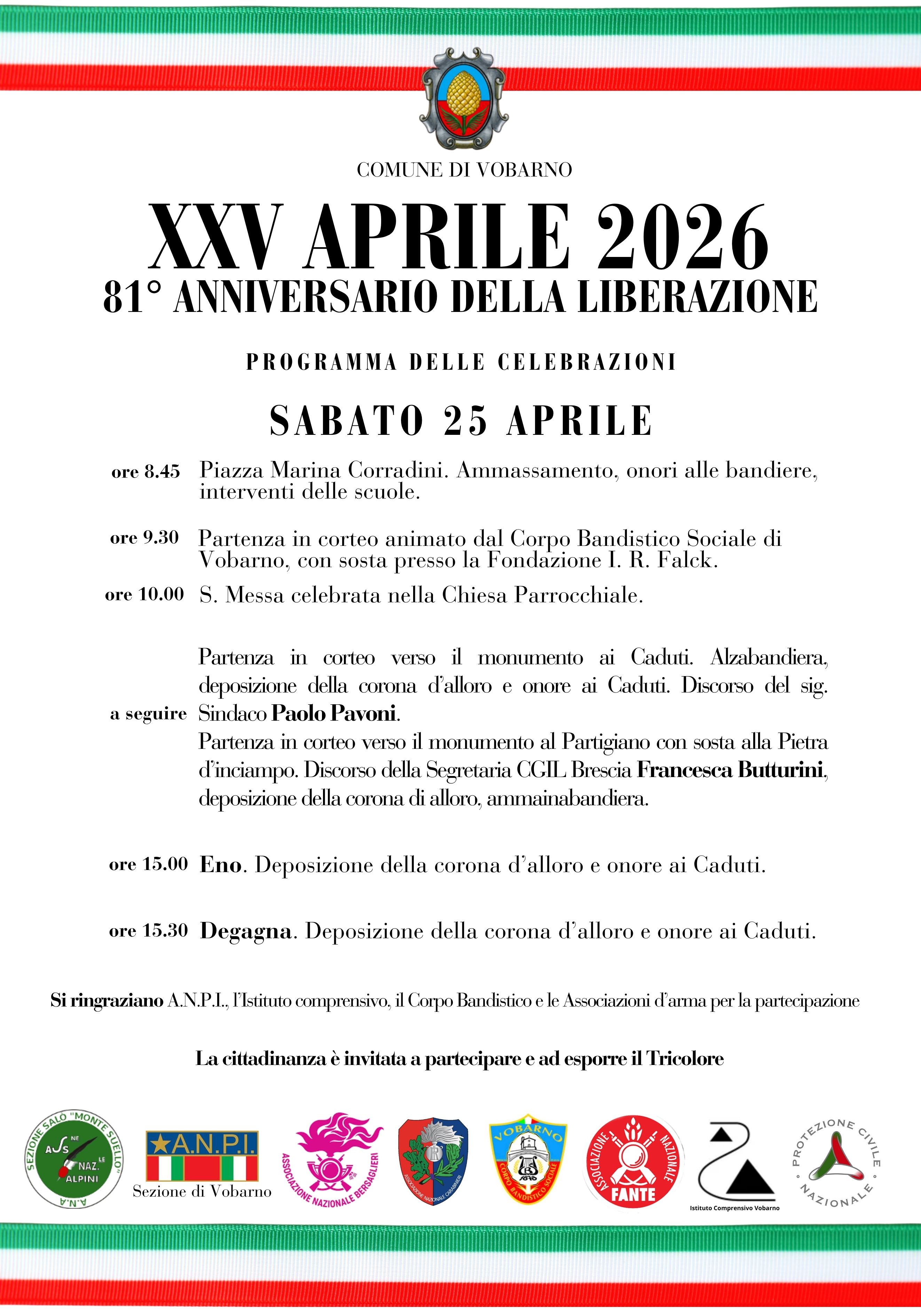 Di seguito il programma delle celebrazioni in programma in occasione della Festa Nazionale del XXV Aprile 2026.