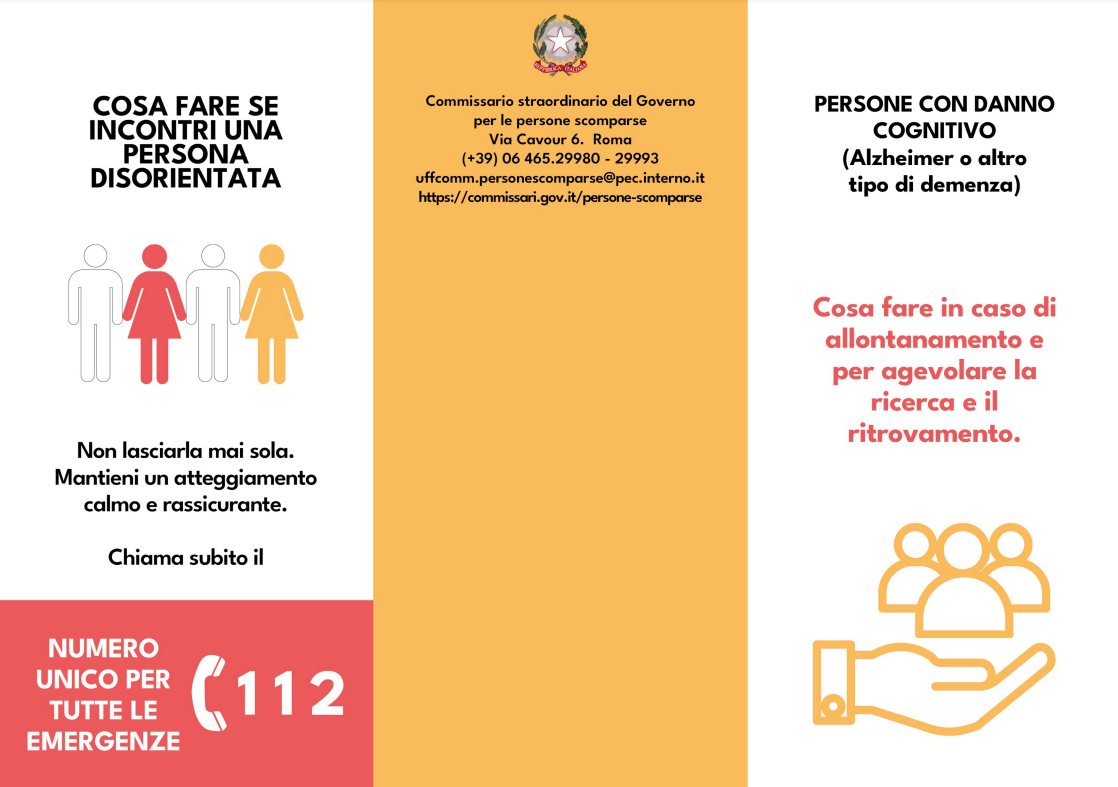 Il Commissario straordinario del Governo per le persone scomparse ha fornito, con la brochure in calce, indicazioni sulle misure da adottare per prevenire l'allontanamento di persone con danno cognitivo e su come agevolarne la ricerca e il ritrovamento in caso di scomparsa.